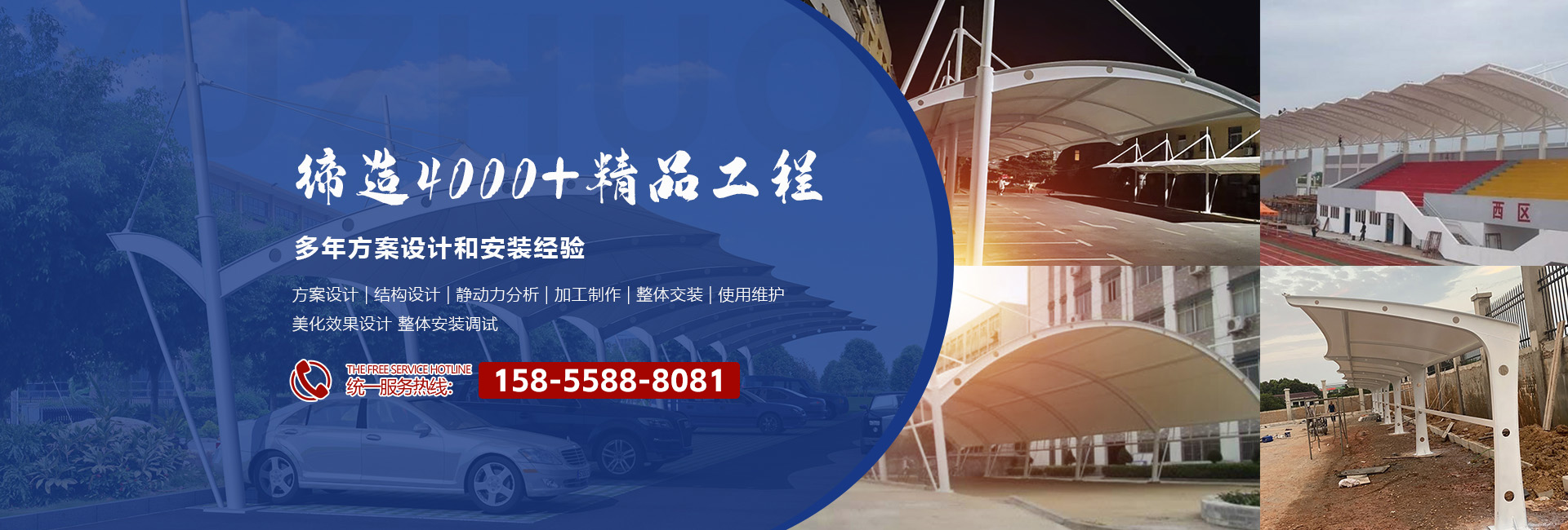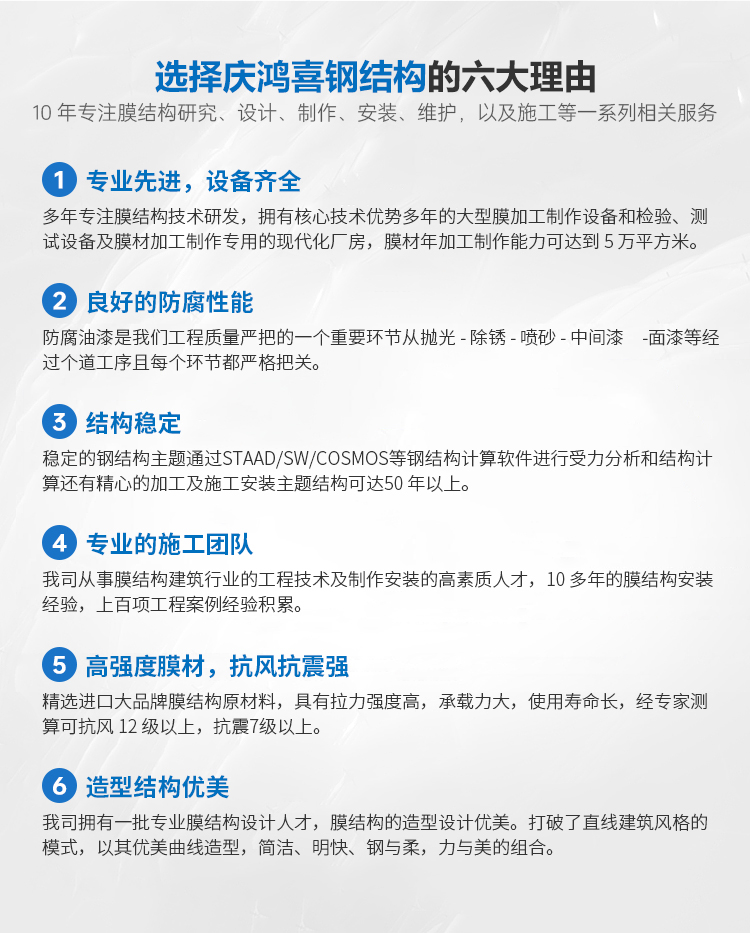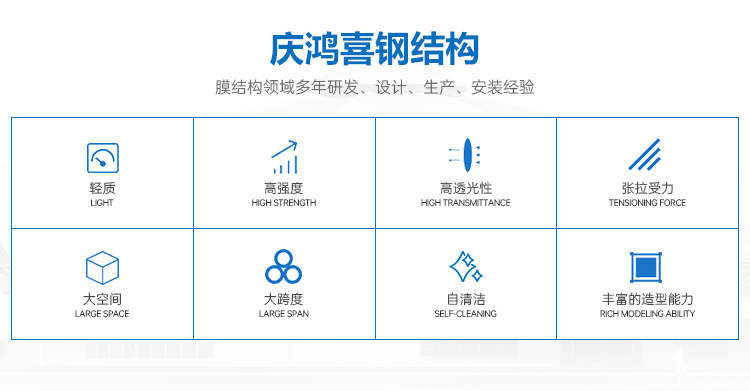 MORE+????????安徽省慶鴻喜鋼結(jié)構(gòu)有限公司是一家專業(yè)從事膜結(jié)構(gòu)工程的綜合性公司。公司秉承“信譽第一、質(zhì)量第一”的宗旨。開拓、發(fā)展、創(chuàng)新的理念。目前公司主營膜結(jié)構(gòu)設(shè)計、膜裁剪設(shè)計、膜材加工及鋼結(jié)構(gòu)安裝與維修。公司擁有一批國內(nèi)較早從事膜結(jié)構(gòu)行業(yè)的高素質(zhì)技術(shù)人員和安裝隊伍,擁有先進的鋼膜設(shè)計軟件3D3S、forten32、和FSCAD,在設(shè)計上大膽創(chuàng)新,在加工上精益求精,在施工上安全認證,在售后上讓客戶使用放心。